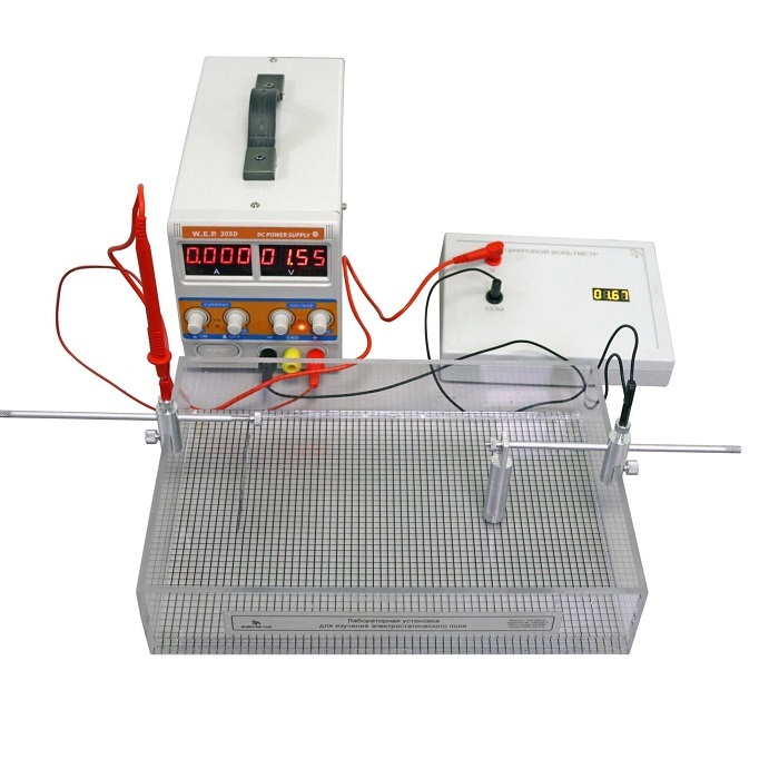 Лабораторная установка «Изучение электростатического поля» предназначена для постановки экспериментального опыта по изучению электростатического поля методом моделирования с помощью электролитической ванны. Данный модуль позволяет проводить исследования распределения потенциала в плоскости электролита с последующим построением эквипотенциальных линий и силовых линий поля. Все элементы модуля конструктивно выполнены в одном блоке.