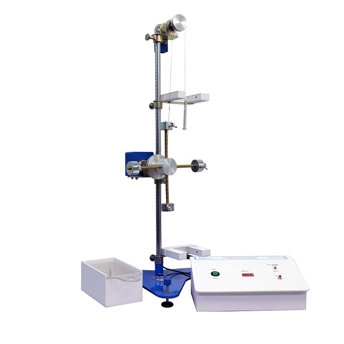Шкив приводится в движение нитью, сматывающейся с барабана под действием прикрепленного к ней наборного груза. Изменение момента инерции вращающегося тела осуществляется перемещением грузов по спицам. Положение грузов определяется с помощью линейки, закрепленной на металлическом стенде.