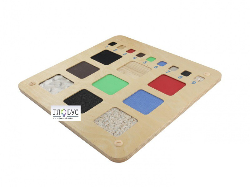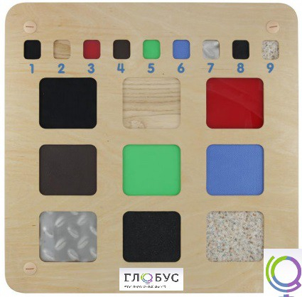 Настенная панель выполнена из березовой фанеры. На лицевой части в больших прямоугольных углублениях расположены 9 образцов различных материалов, для тренировки тактильных навыков. В верхней части панели   расположены пронумерованные материалы, схожие с  образцами. По углам панели размещены отверстия для крепления панели к стене.